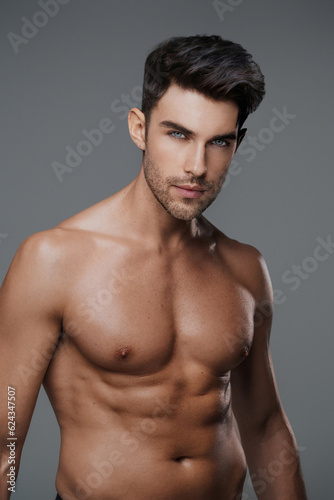 © Fxquadro, Fototapeta premium Charismatic close-up of a shirtless brunette model with a fit and toned physique against a modern gray backdrop