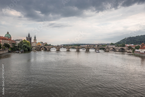 Obraz premium Charles Bridge (Karluv Most), as seen from Manes Bridge, most famous historic sandstone bridge over Vltava river in Prague, most visited site in Prague, Czech Republic.