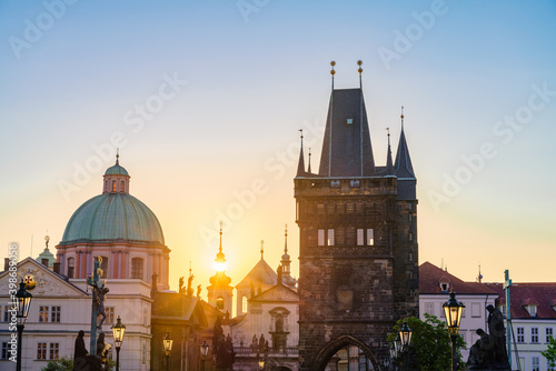 Naklejka premium Charles bridge tower at sunrise in Prague, Czech Republic