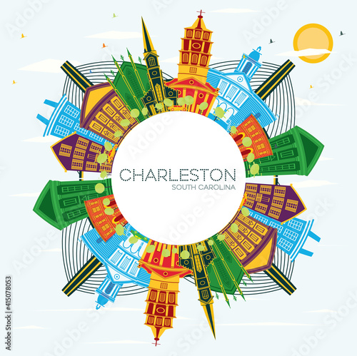 Obraz premium Charleston South Carolina City Skyline with Color Buildings, Blue Sky and Copy Space.