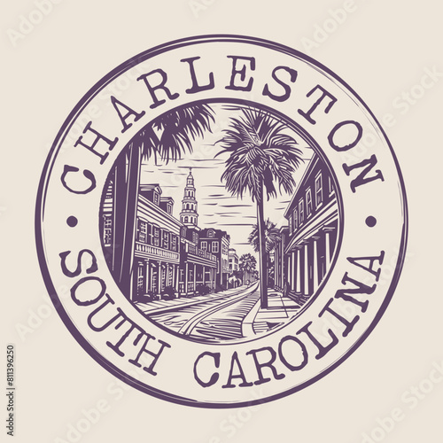 Obraz premium Charleston, South Carolina Stamp City Postmark. Silhouette Postal Passport. Round Vector Icon. Vintage Postage Design.