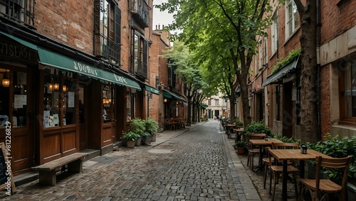 © Kasper, Obraz premium Charming alleyway lined with trees and cafes in the city.