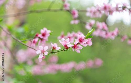 Fototapeta premium Charming almond blossom branch in spring in Borjomi, Georgia, closeup