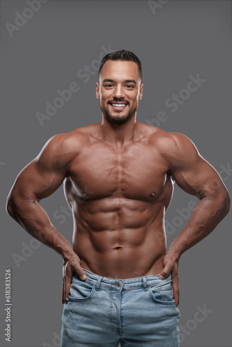 © Fxquadro, Fototapeta premium Charming and muscular male model with a dazzling smile poses shirtless against a neutral grey backdrop, emanating confidence and sex appeal