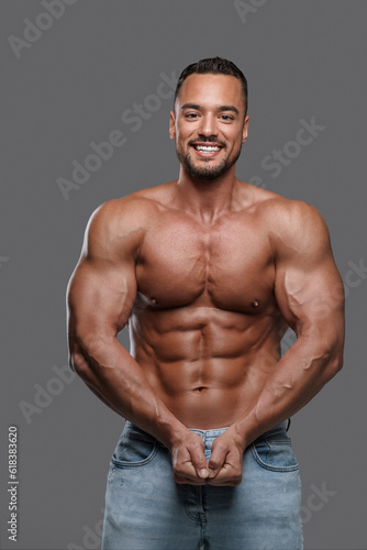 Fototapeta premium Charming and muscular male model with a dazzling smile poses shirtless against a neutral grey backdrop, emanating confidence and sex appeal