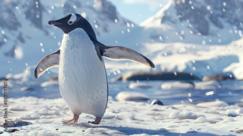 Fototapeta premium Charming animated penguin standing on snowy terrain with mountains in the background and snowflakes falling gently.