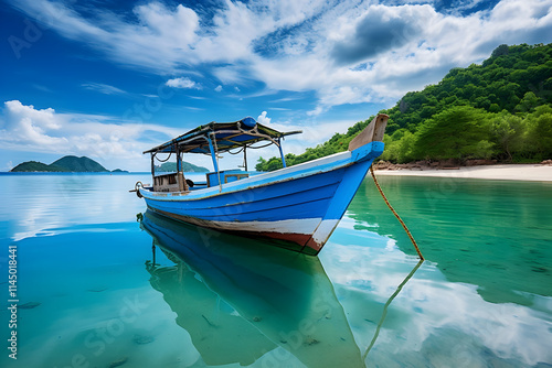 © Brett, Fototapeta premium Charming Antique Boat Anchored amidst Lush Seascape - A Stunning Capture of Maritime Beauty and Tranquil Seashore