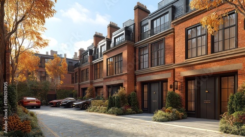 Naklejka premium Charming autumn scene featuring elegant brick townhouses lined with colorful...