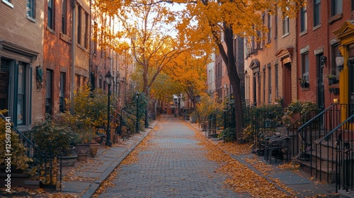Fototapeta premium Charming Autumn Street with Golden Leaves and Historic Townhouses