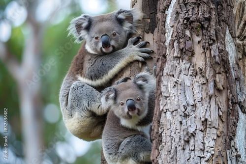 © Ratchadaporn, Obraz premium Charming Baby Koalas Climbing up a Eucalyptus Tree in Natural Habitat
