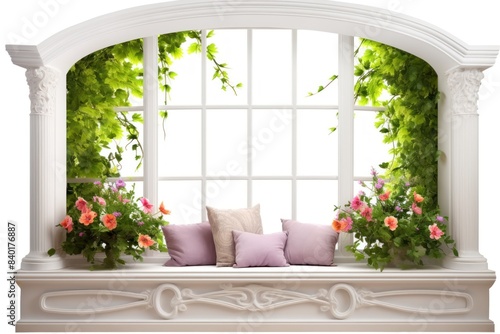 © Phuwadon, Fototapeta premium Charming bay window with cushioned window seat and blooming flowerpots, nestled amidst lush greenery, isolated on white background.