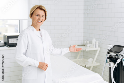 Fototapeta premium Charming beautician in white lab coat standing near daybed covered with sheet