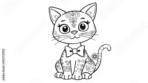 Obraz premium Charming black and white cat illustration with ornamental floral patterns and a bow tie