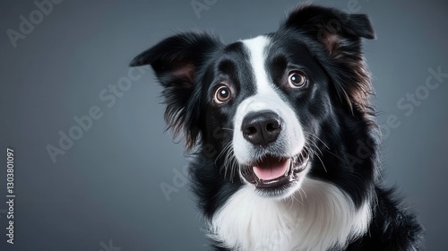 Fototapeta premium Charming Black and White Dog with Expressive Eyes on Gray Background in...