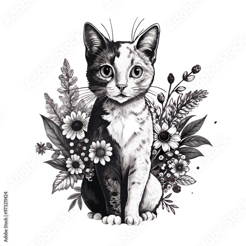 Obraz premium Charming black and white graphic illustration of a cat surrounded by flowers...
