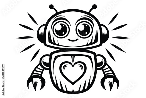 © Shimul, Naklejka premium Charming Black and White Robot with Heart on Chest with White Background