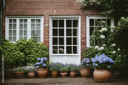 © gamespirit, Fototapeta premium Charming brick house with blooming gardens in pots, showcasing blue hydrangeas and lush greenery, creating a serene outdoor space in early summer