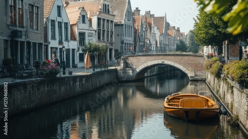 © isrofiyah, Fototapeta premium Charming Bruges Canal Scene: Picturesque Rowboat Docked Under a Brick Bridge, Medieval Buildings Reflecting on Calm Water
