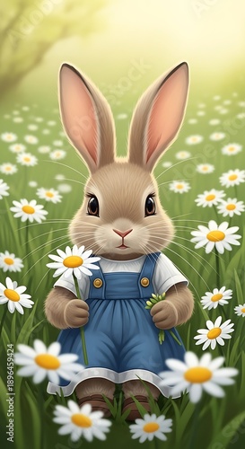 © rendi, Fototapeta premium Charming Bunny in Daisy Field - A Whimsical Spring Illustration.