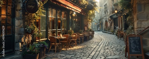 Fototapeta premium Charming café nestled on a cobblestone street, 4K hyperrealistic photo