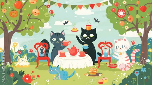 Naklejka premium Charming cartoon cats enjoying a tea party in a colorful garden, surrounded by flowers, trees, and festive decorations.
