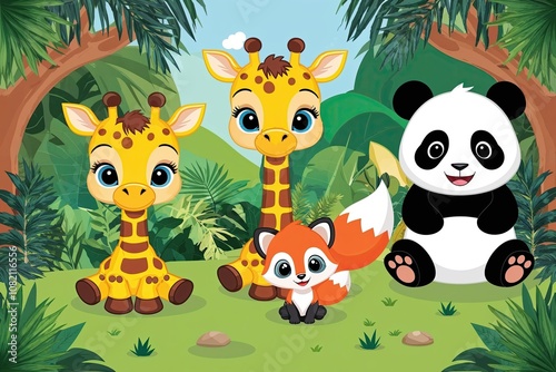 © Michael, Naklejka premium Charming Cartoon Giraffe Fox and Panda Characters in Playful Jungle Wildlife Art