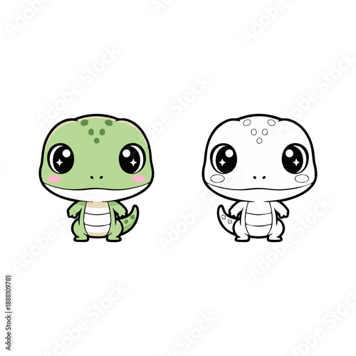 © MuhammadRyan, Obraz premium Charming cartoon green lizard illustration, featuring a delightful creature with an outline version, ideal as an editable vector graphic for design