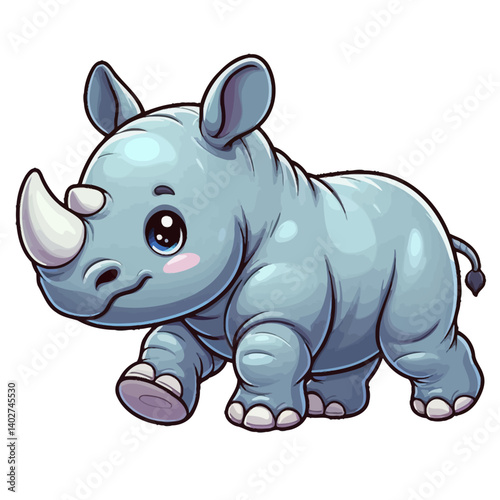 Fototapeta premium Charming cartoon illustration of a cute baby rhinoceros with big, adorable eyes, characteristic horns, and a gentle expression, taking a step. Represents adorable animals, African wildlife, and childr