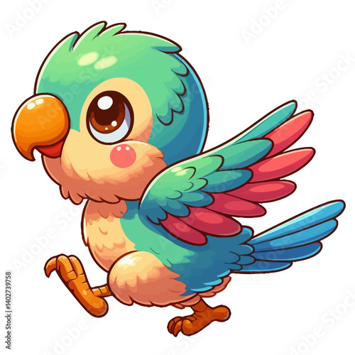 Naklejka premium Charming cartoon illustration of a cute blue parrot with big, adorable eyes and a cheerful expression, taking a step. Represents adorable animals, tropical birds, and children's themes.
