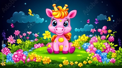 Obraz premium Charming cartoon illustration of a cute pink unicorn surrounded by vibrant flowers under a starlit sky enchanting children's artwork creation