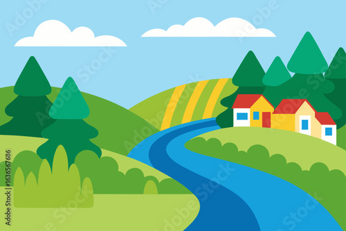 Fototapeta premium Charming cartoon landscape with rolling green hills a winding blue river and quaint houses nestled among trees
