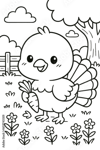 Obraz premium Charming cartoon turkey holding carrot in a whimsical outdoor scene vector