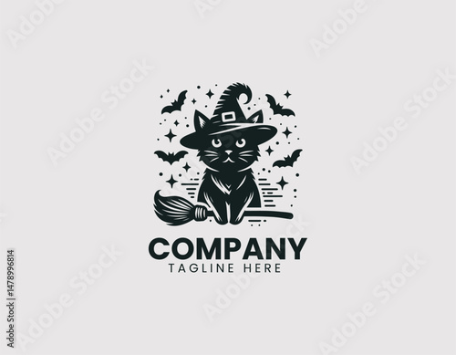 Fototapeta premium Charming Cat Wearing Witch Hat with Broom Illustration Vector Logo Design, Cute Cat in Witch Hat Riding Broomstick Vector Logo