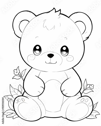 Fototapeta premium Charming Chibi Bear Line Art Coloring Page for Kids with Big Eyes and Playful...