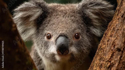 © netsay, Naklejka premium Charming Closeup Portrait of a Grazing Koala Phascolarctos Cinereus Perfect for Naturefocused Projects, Evoking Calm and Tranquility.