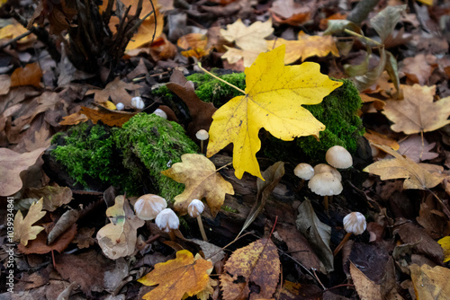 © Kira G., Fototapeta premium Charming Cluster of Mushrooms on Moss with Autumn Leaf in Forest Setting
