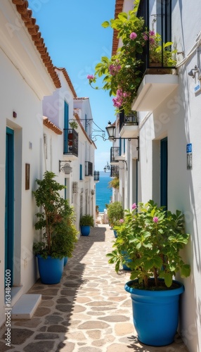 Fototapeta premium Charming coastal alleyway adorned with vibrant flowers