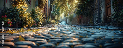 © Coosh448, Naklejka premium Charming cobblestone alleyway in a historic town, 4K hyperrealistic photo