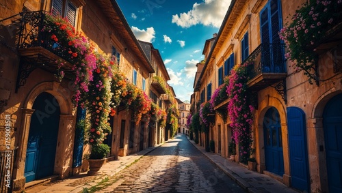 Fototapeta premium Charming cobblestone street adorned with vibrant flowers and colorful doors...