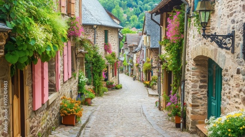 © Puttipong, Fototapeta premium Charming Cobblestone Street in a Flower-Filled Village