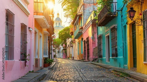 Obraz premium Charming Cobblestone Street in Historic Town at Sunset