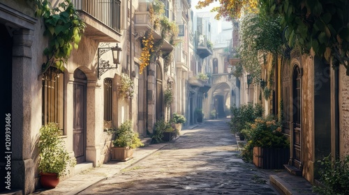 © kitidach, Fototapeta premium Charming cobblestone street lined with lush greenery and historic architecture.