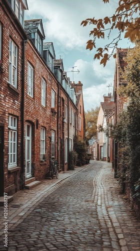 © kitidach, Fototapeta premium Charming cobblestone street lined with old brick houses under a cloudy sky.