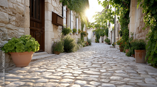 Fototapeta premium Charming cobblestone street lined with potted plants in quaint village