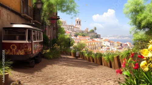© darion, Naklejka premium Charming cobblestone street with a vintage tram and vibrant flowers.