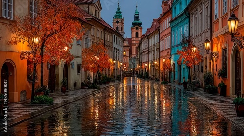 © Patria, Fototapeta premium Charming Cobblestone Street with Colorful Buildings and Autumn Trees Reflecting in Wet Pavement