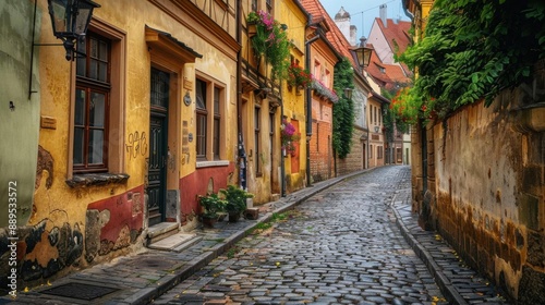 Fototapeta premium Charming cobblestone street with colorful historic buildings, creating a...