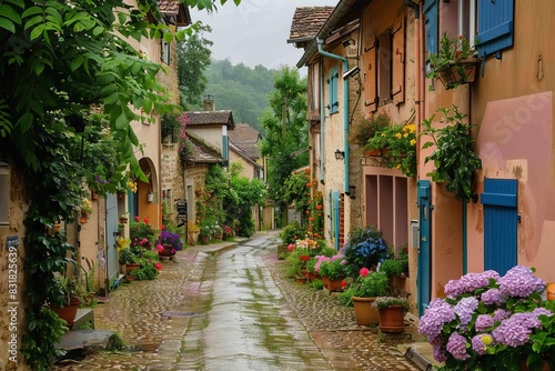© nattapon98, Fototapeta premium Charming cobblestone street with colorful houses and lush greenery, showcasing a picturesque and serene village atmosphere.