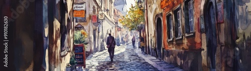 Obraz premium Charming cobblestone street with vibrant buildings and a lone figure walking,...
