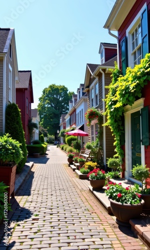 Fototapeta premium Charming cobblestone streets wind through Rye's historic district, showcasing quaint architecture and lush greenery. The sun-drenched scene evokes a sense of t, peaceful, greenery